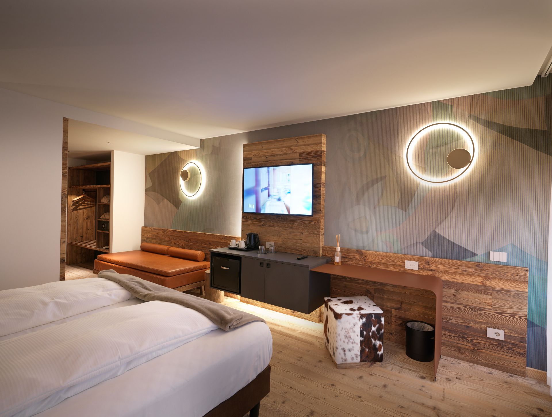 Accogliente e raffinata, la nostra camera Dosso vi immerge in un’atmosfera di relax e benessere, valorizzata da arredi in legno su misura che donano calore e personalità agli spazi. I mobili, realizzati con cura artigianale e finiture di qualità, uniscono funzionalità e design, creando un ambiente armonioso e accogliente. Ogni dettaglio è studiato per offrire comodità e stile, trasformando il soggiorno in un’esperienza unica, dove il fascino della montagna incontra l’eleganza contemporanea dei nostri arredi in legno.