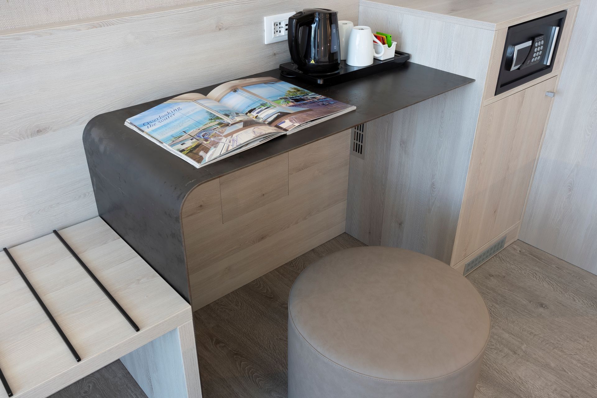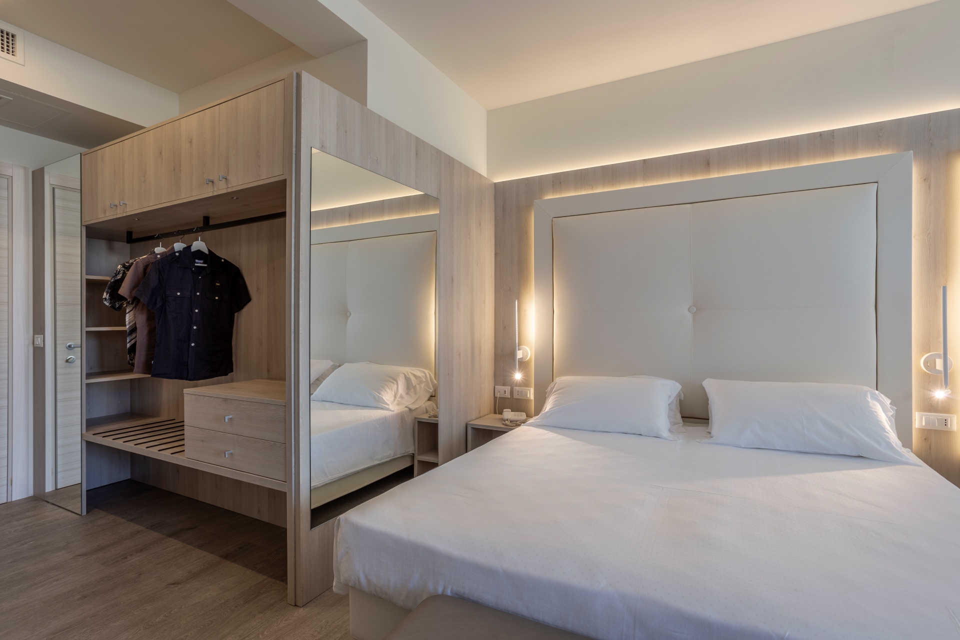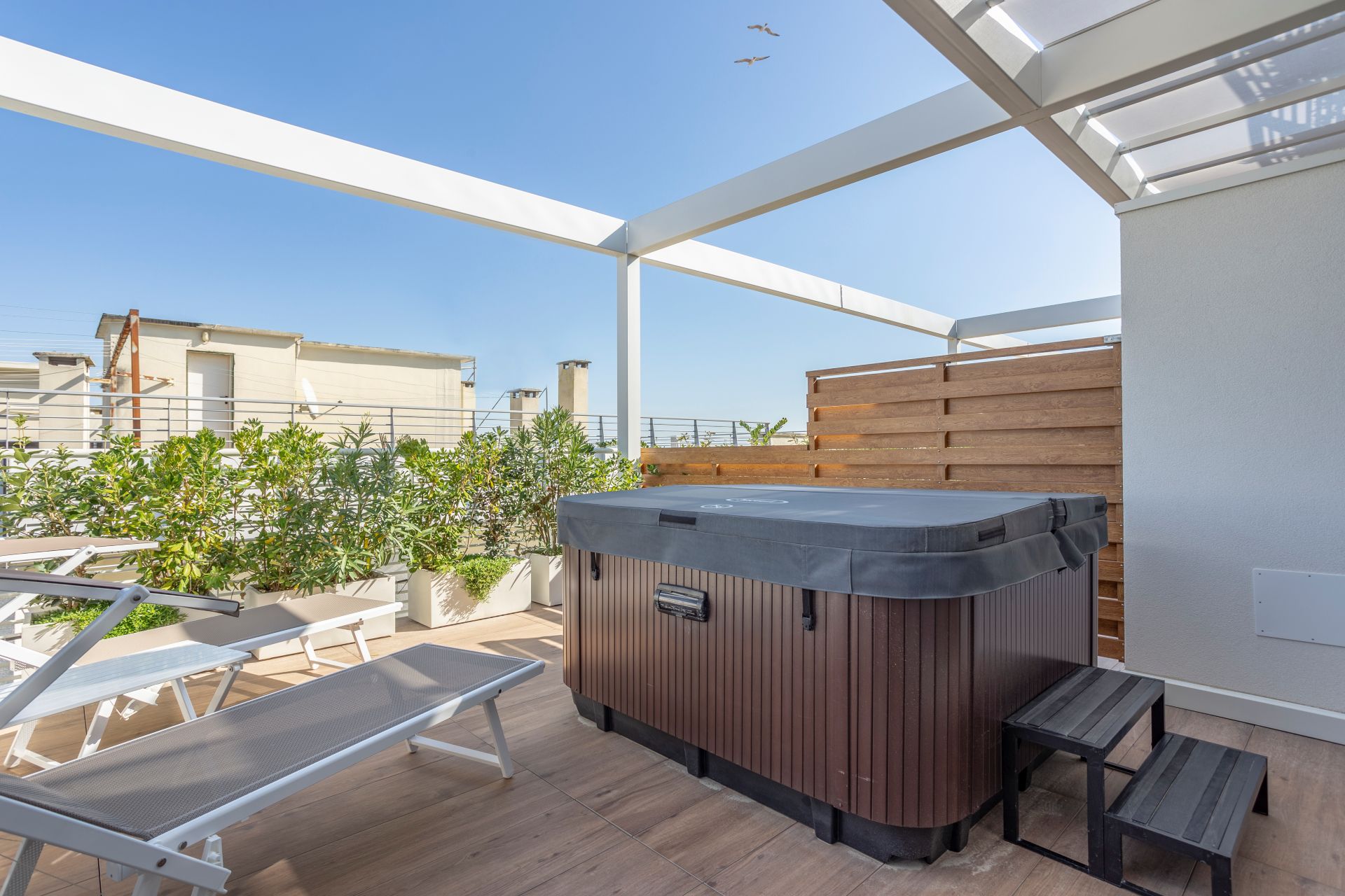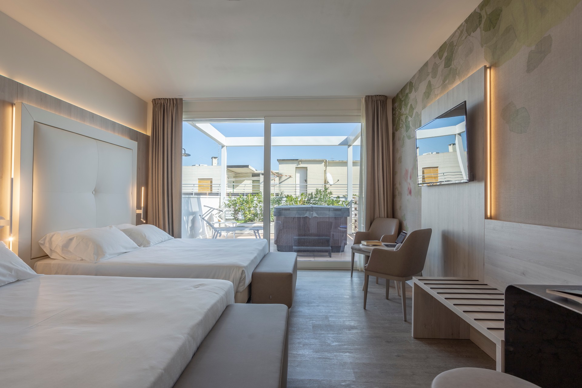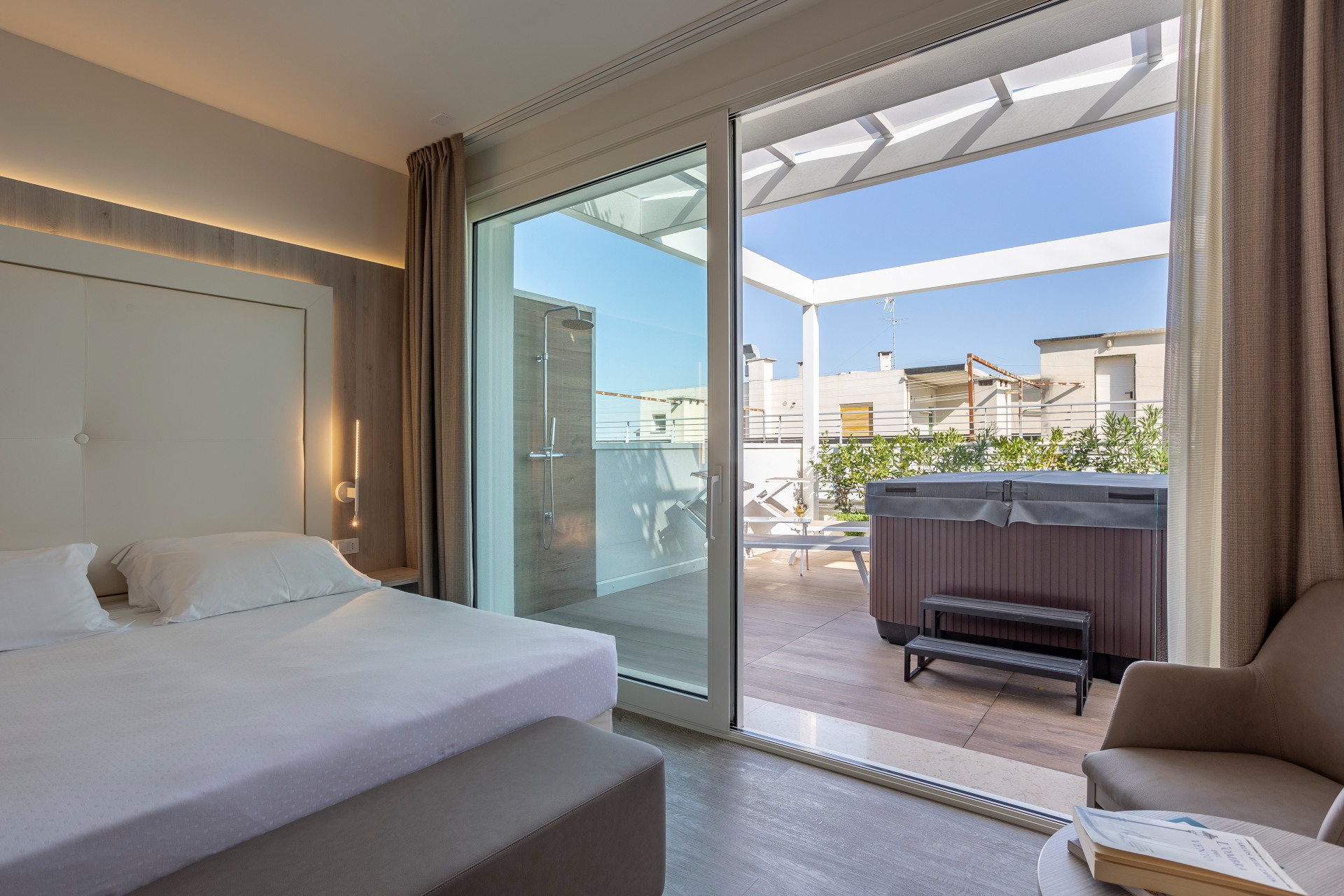 Situata all’ultimo piano dell’hotel, la Suite Maestrale è stata arredata su misura da Chinber, con mobili di design e dettagli in legno naturale che uniscono stile e funzionalità. L’ampio terrazzo panoramico di 25 m², con vista mare laterale, è dotato di una mini-piscina Jacuzzi con idromassaggio e di un set prendisole di design, per un’esperienza di relax assoluto in un ambiente esclusivo e curato in ogni dettaglio.