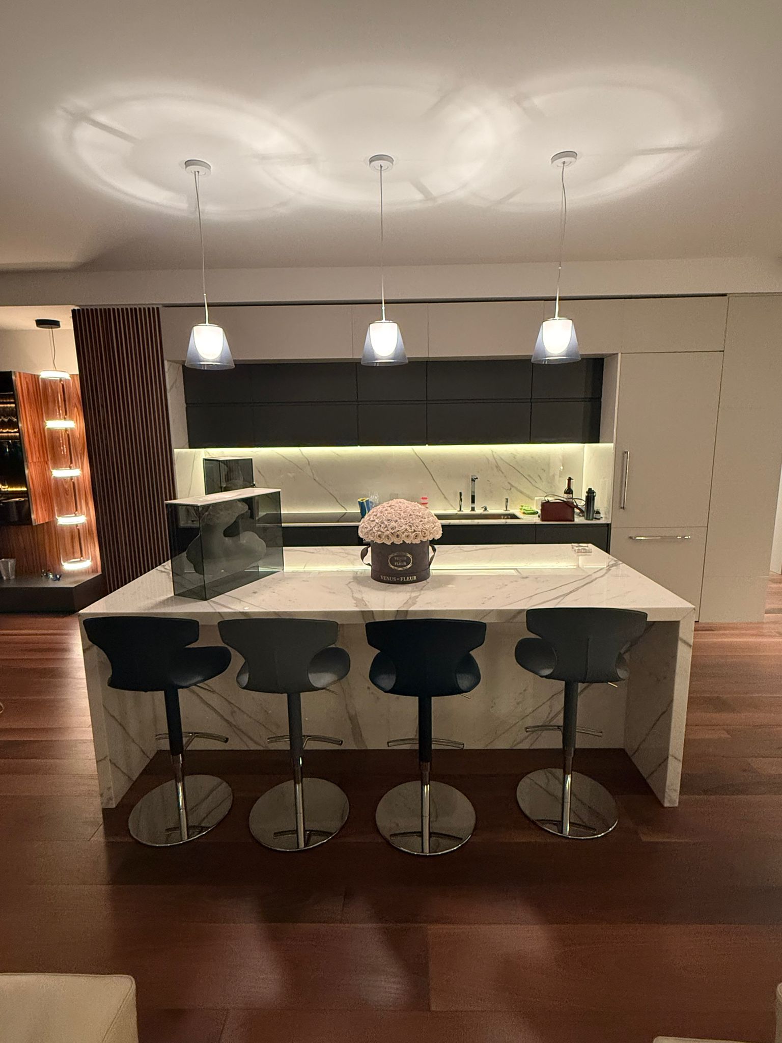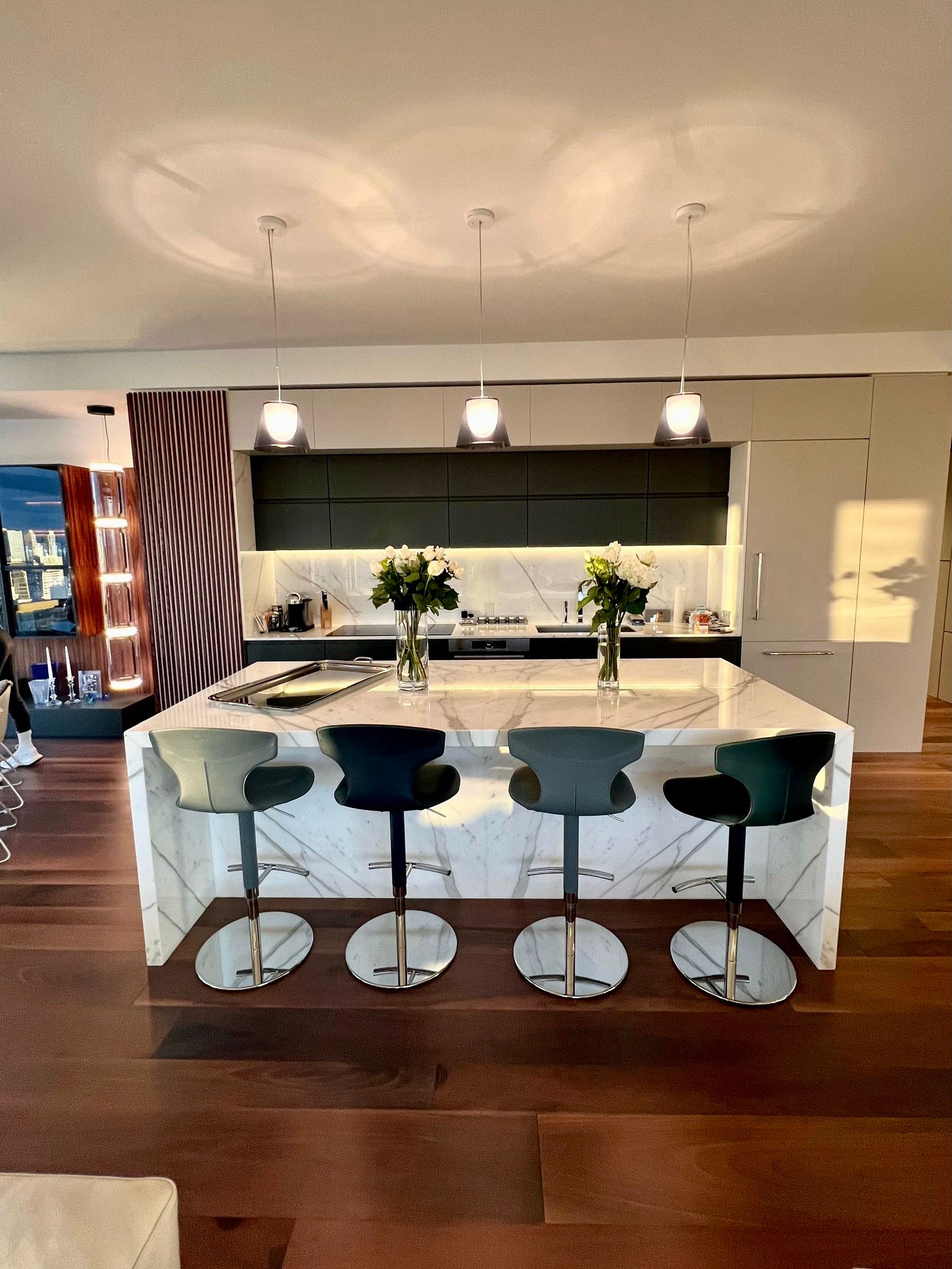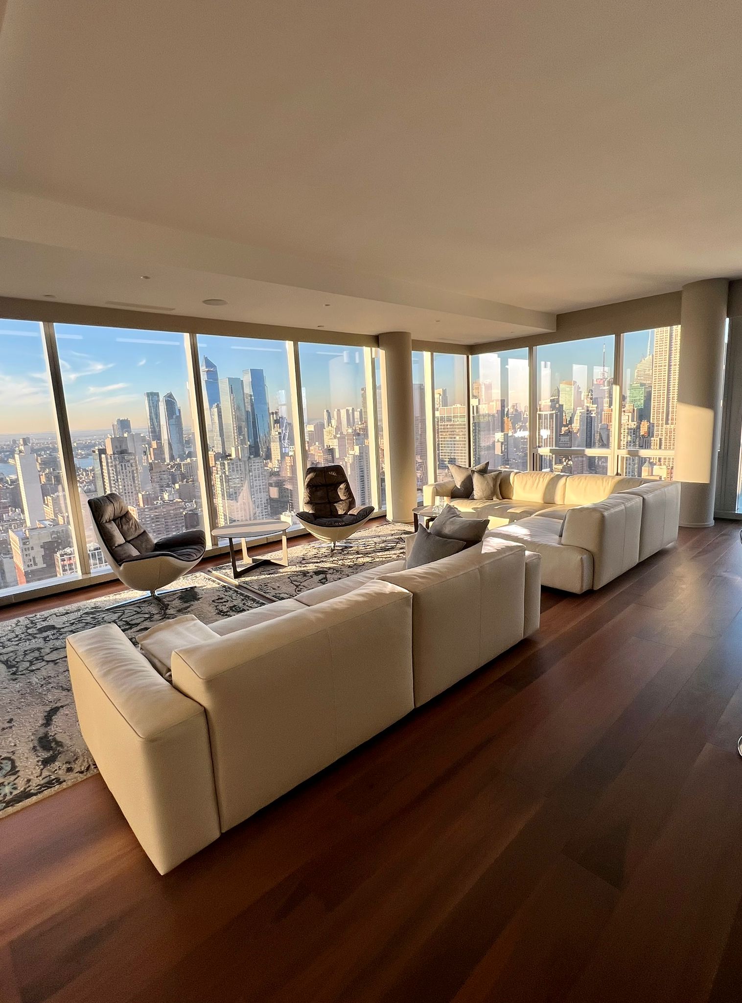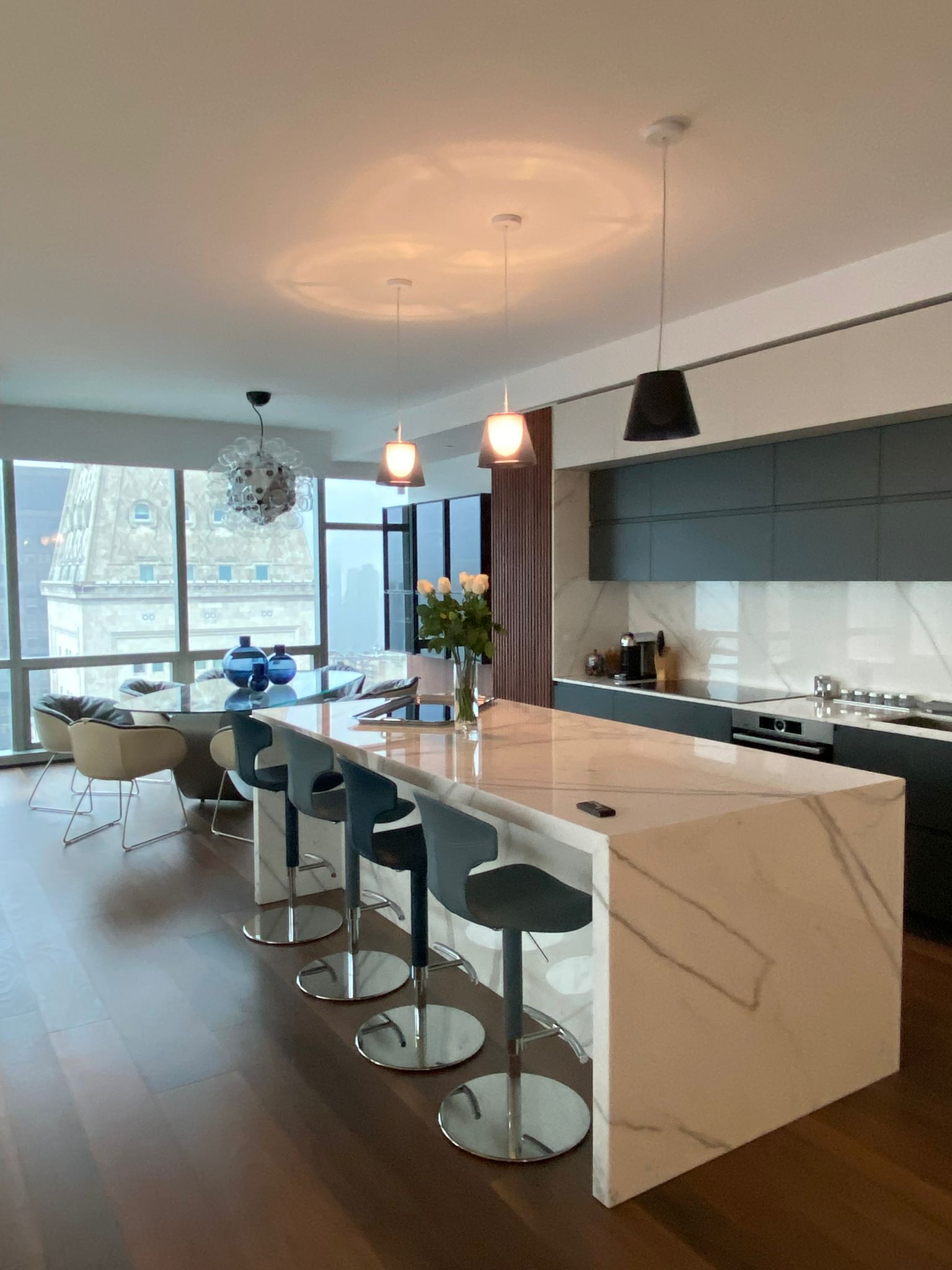 Il living room con splendide viste abbraccia lo skyline grazie alle vetrate a tutta altezza, mentre la cucina attrezzata permette di vivere la città con i tuoi ritmi: colazione con vista sui grattacieli, cene intime dopo una giornata in Midtown. Spazi luminosi e funzionali per un appartamento che unisce stile, autonomia e comfort.