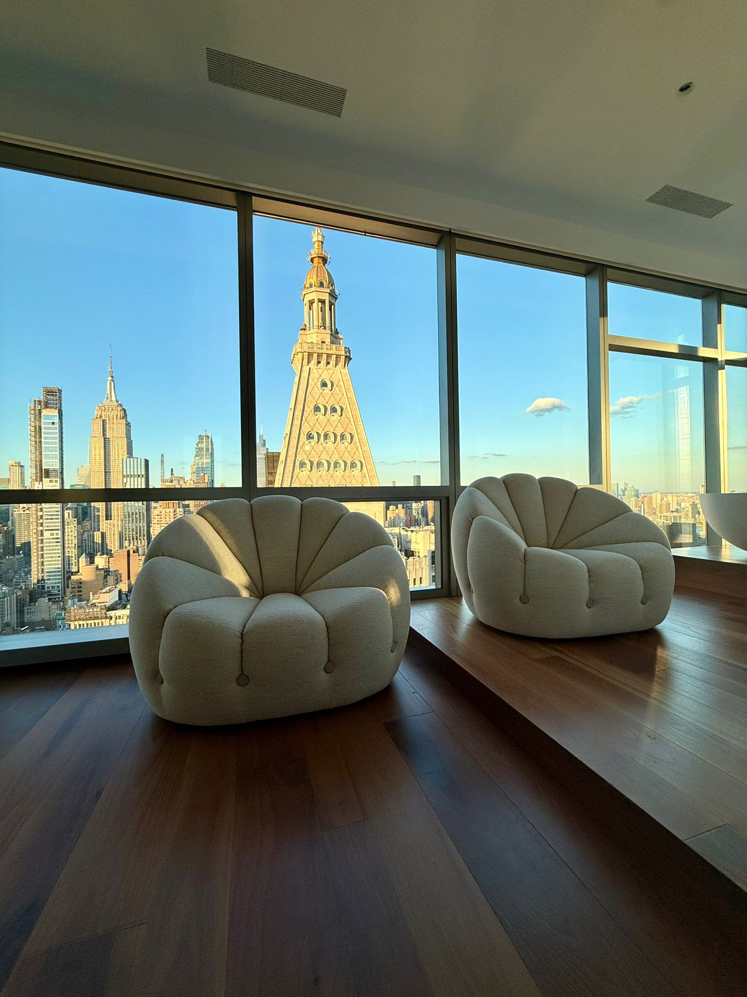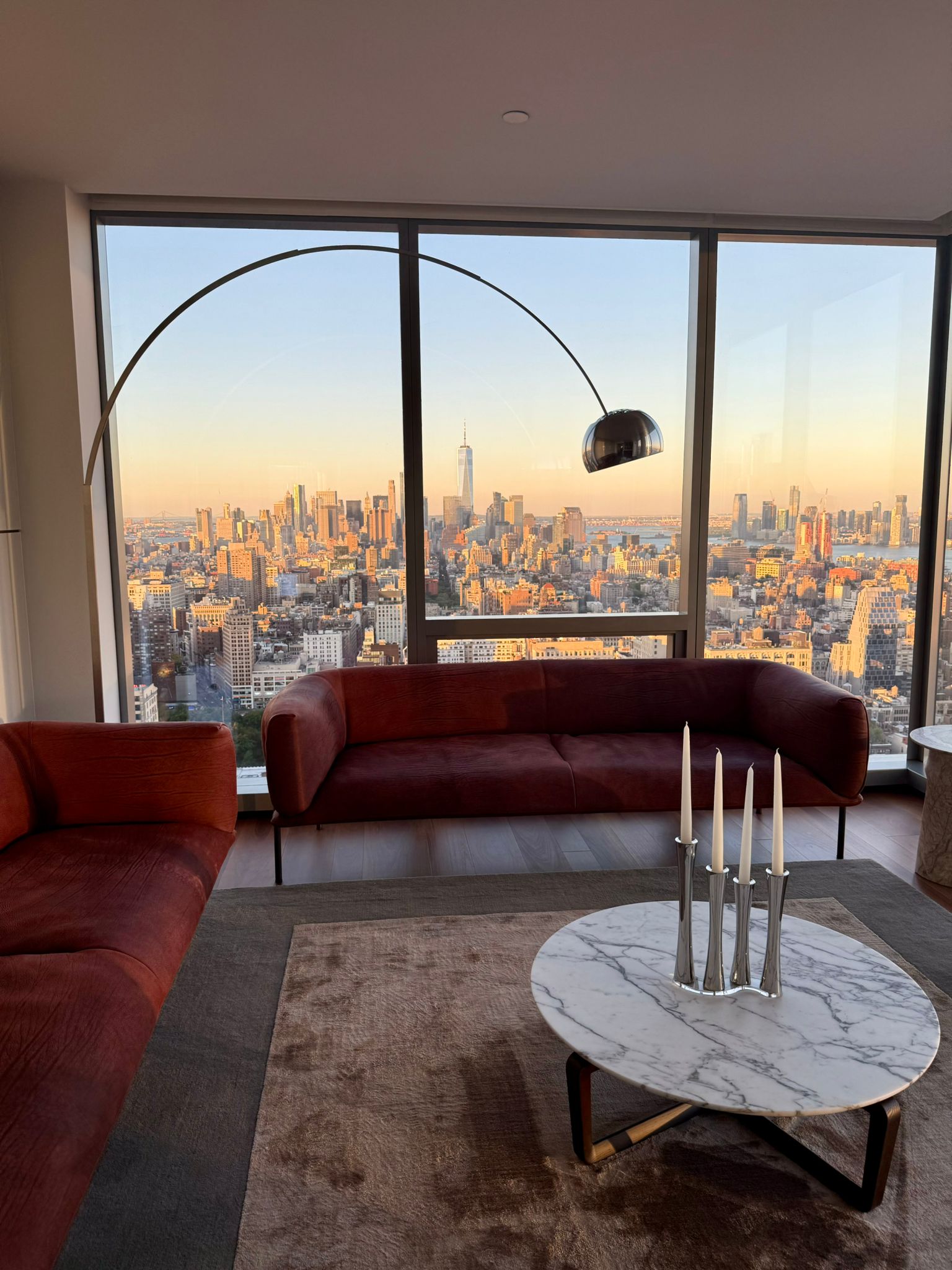Arredi di design, impreziositi da dettagli eleganti, creano un ambiente caldo e raffinato che dialoga con la luce di New York.