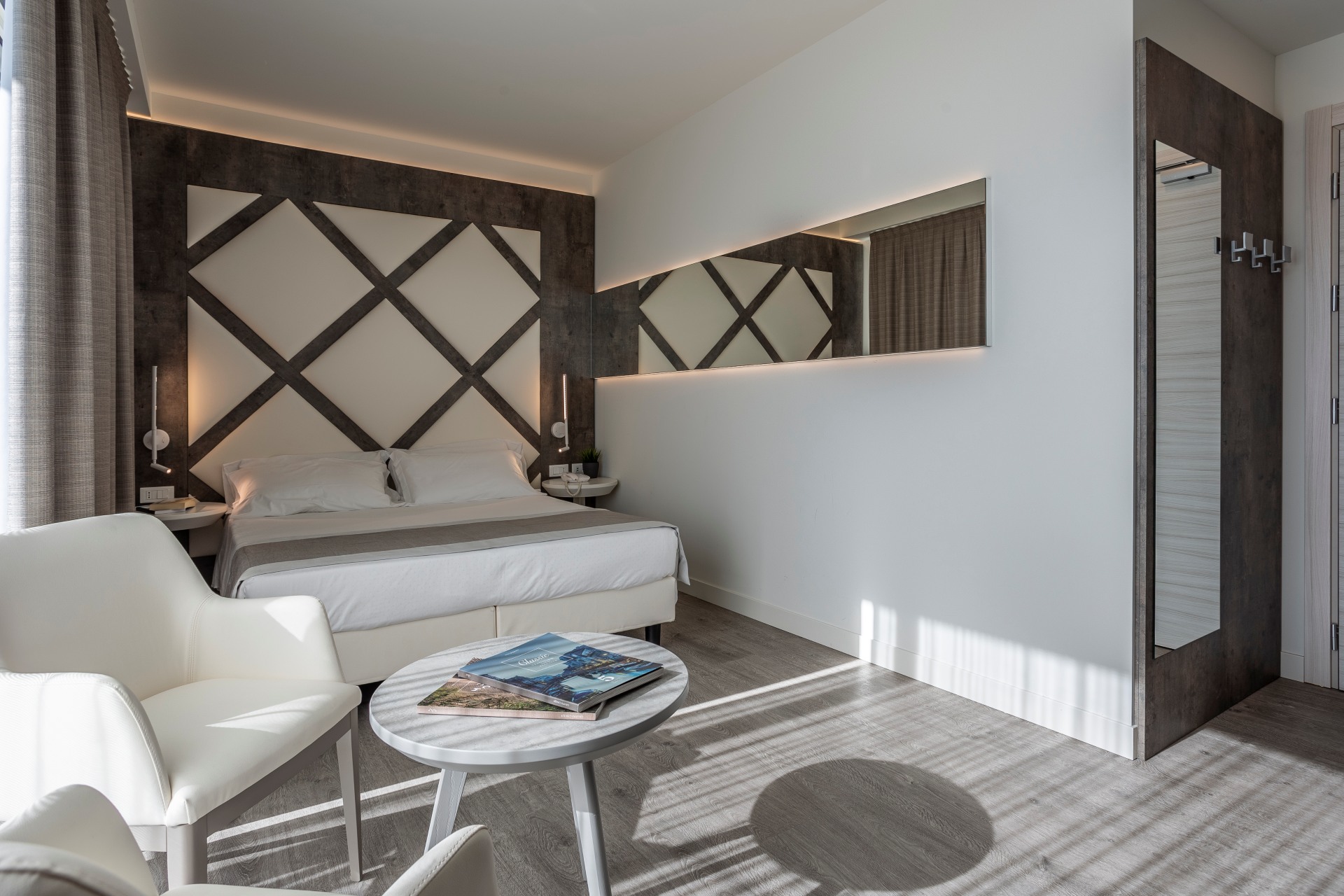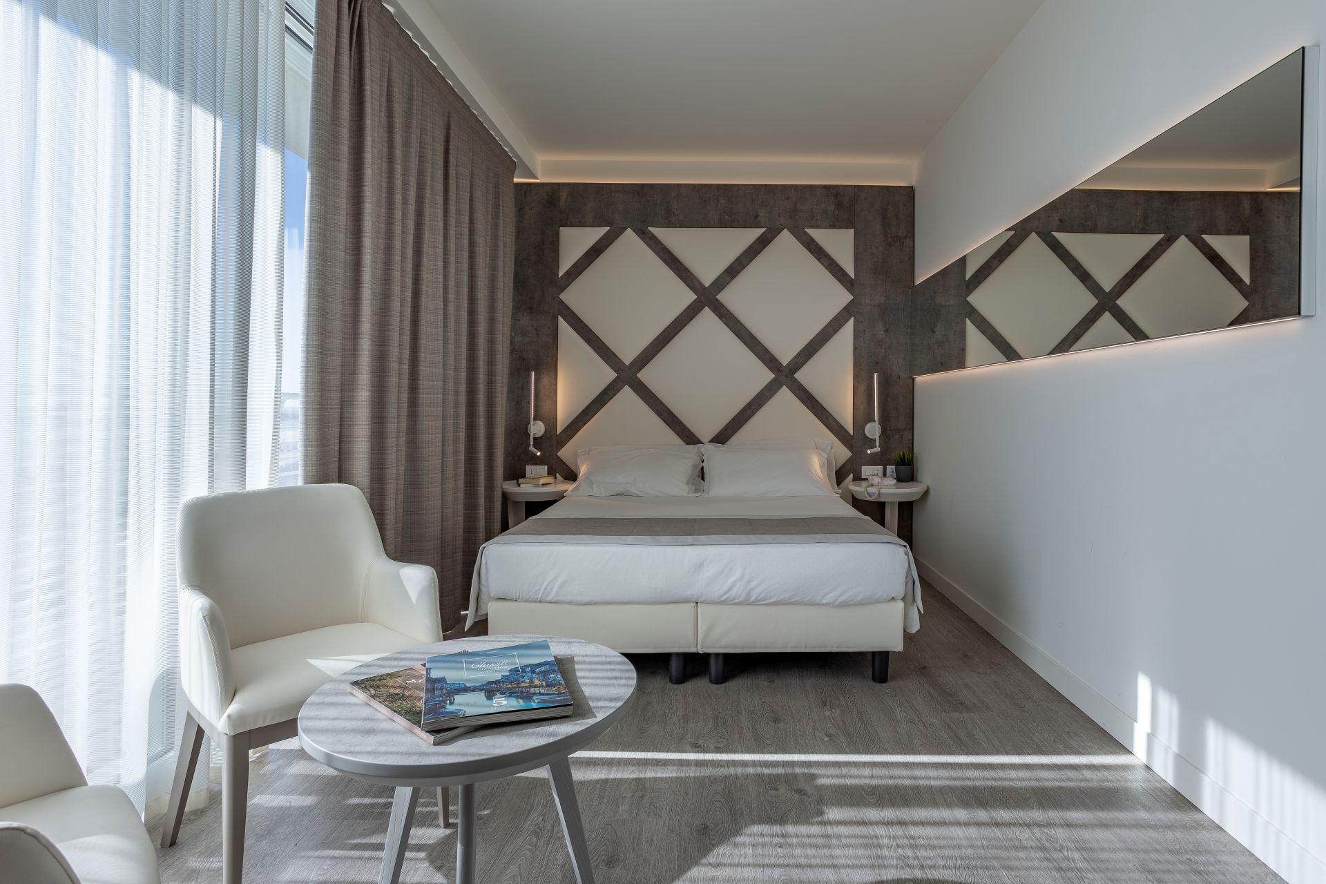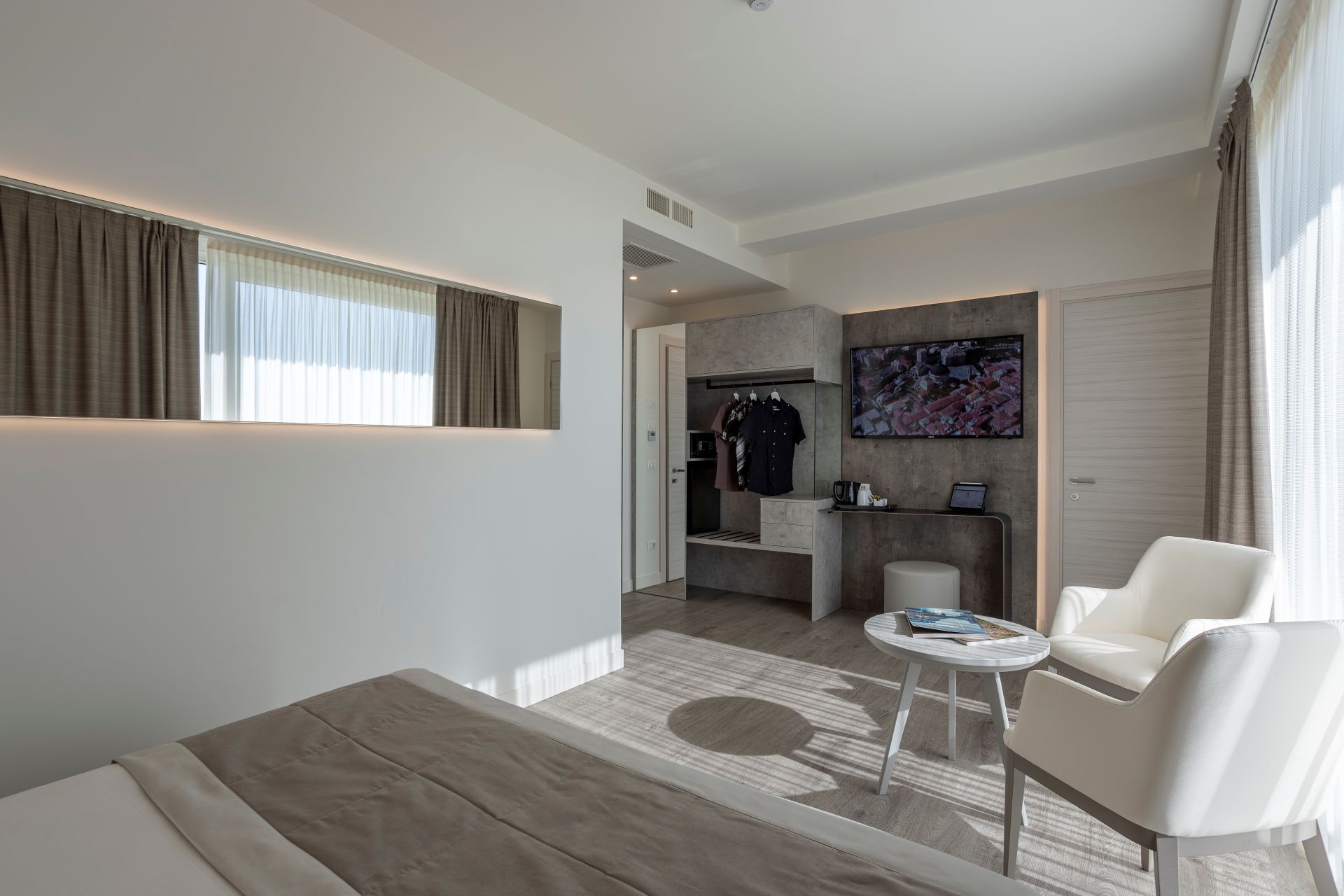 Gli arredi di design, impreziositi da eleganti dettagli in legno naturale, creano un ambiente caldo e raffinato che dialoga con la luce del mare.