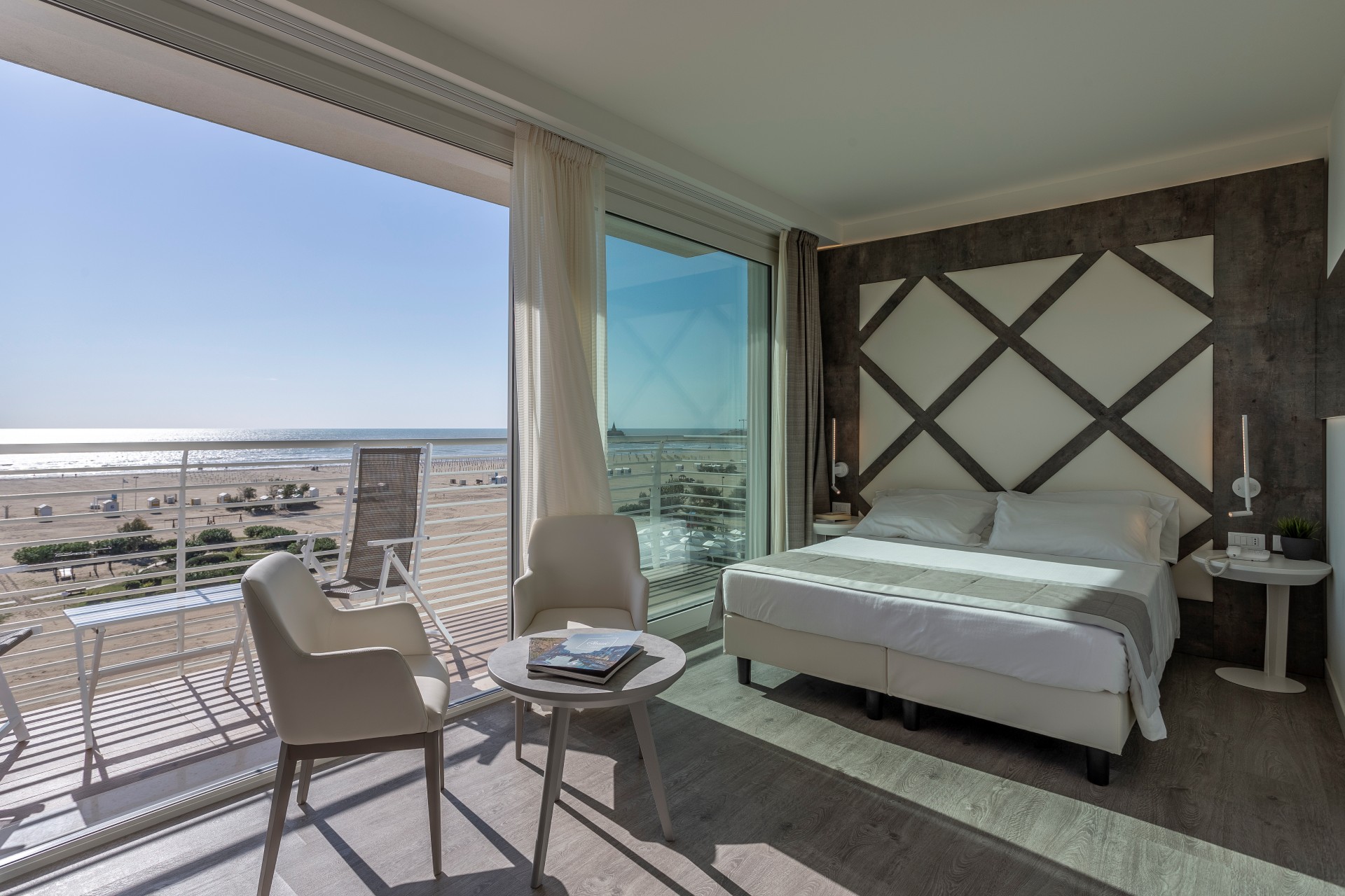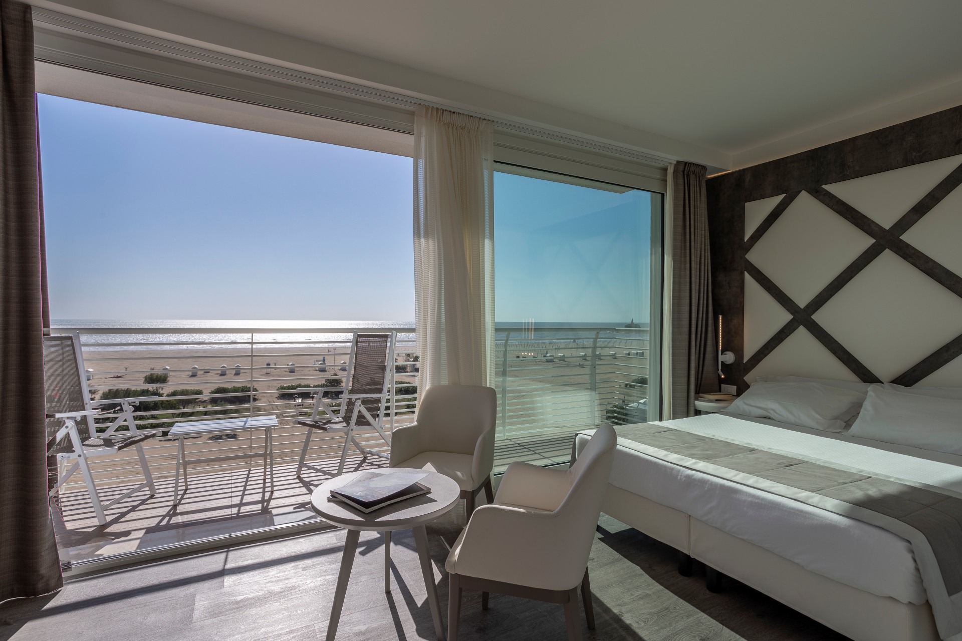 Un ampio terrazzo panoramico fronte mare, arredato con sedie marinelle reclinabili in finitura lignea e un tavolino coordinato, regala una vista indimenticabile sull’ansa della Madonnina dell’Angelo, simbolo di Caorle, per un soggiorno che unisce comfort, stile e autenticità.